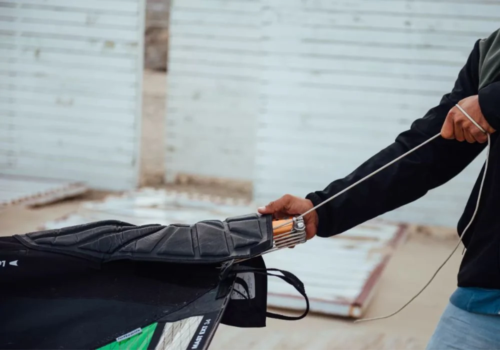 Hierbij is vooral het secuur op- en aftuigen van het zeil een belangrijk onderdeel. Het meest ideale is om je windsurfzeil op- en uit te rollen op het gras, zand kan namelijk krassen maken op het monofilm.